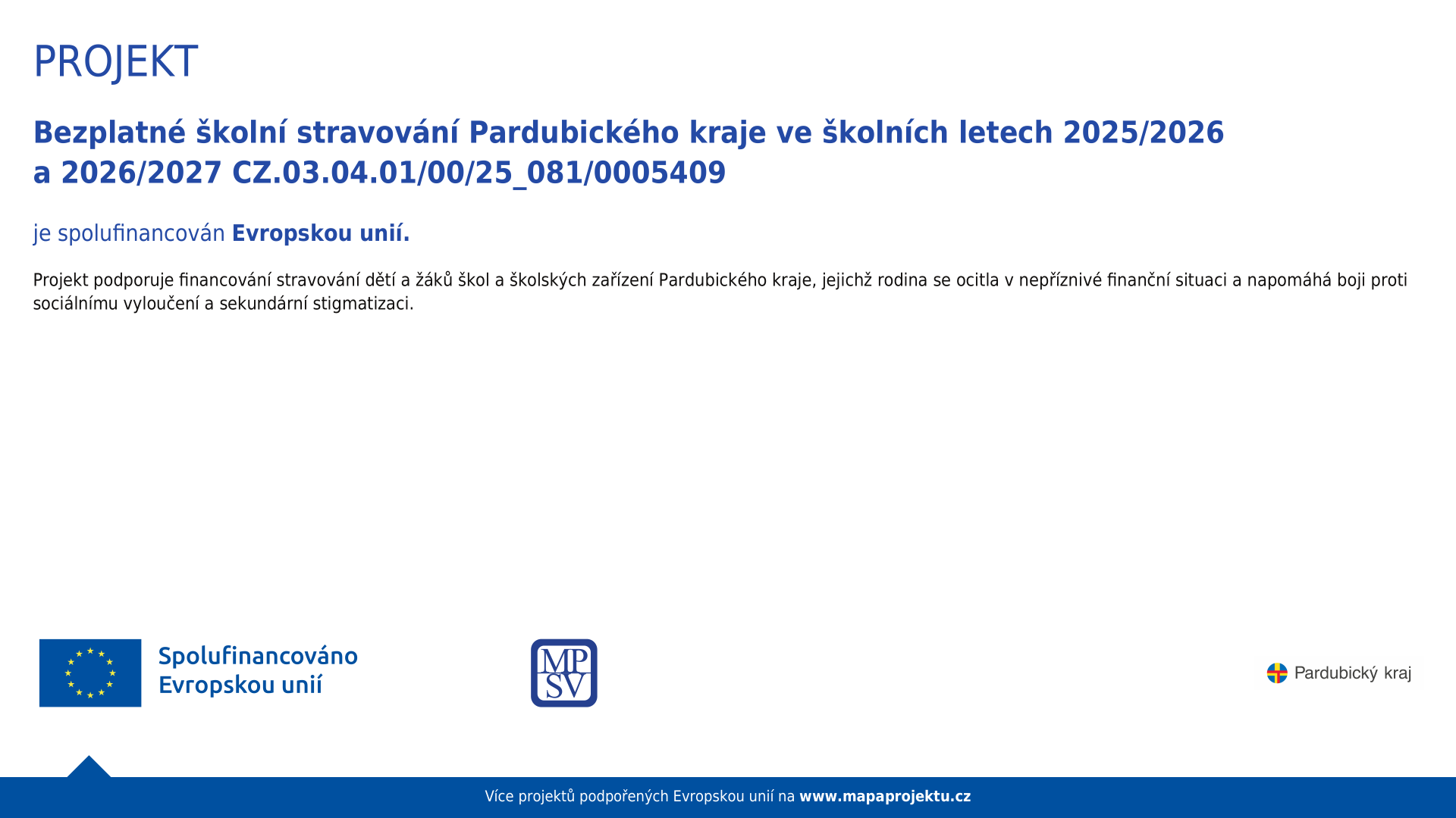 Škola je zapojena do projektu Bezplatného školního stravování Pardubického kraje ve školním roce 2025/2026.